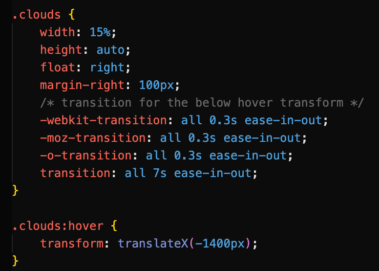 Here we use the transition property to specify that the cloud should move horizontally by 1400px over a duration of 7 seconds. Using ease-in-out, the cloud starts off slowly when we hover over it, builds momentum as it moves to the left, then slows down towards the end of the transition. Note that the transition is applied to the cloud image itself, while the transform property belongs with the triggering event (in this case, .clouds:hover).