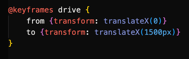 We begin by defining our keyframes. The car is a PNG image that will move from the left to the right of the page by 1500px. We can use from and to to do this: