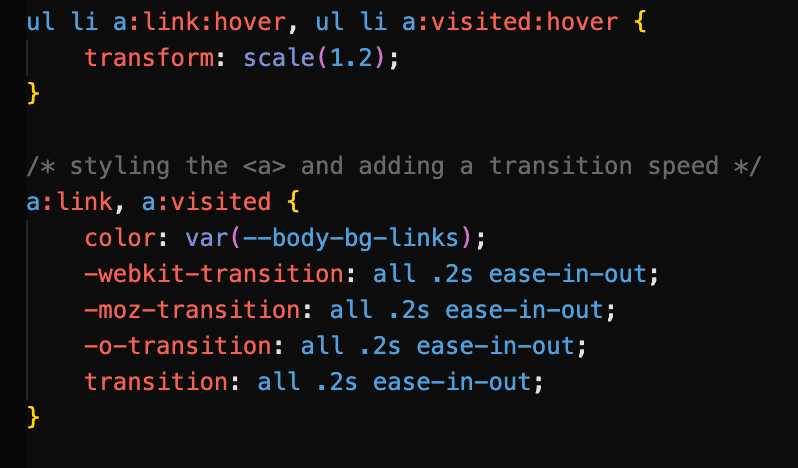 Here’s an example of a transition that uses vendor prefixes to support older browsers. Each link icon has a transform: scale() on hover applied to it with a transition: