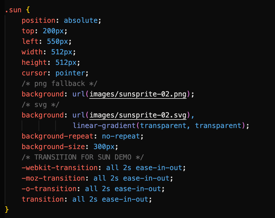 As a fallback, we have set a PNG of the sprite image just before the SVG version in the cascade. This way, the sun will still appear and work as expected, even if an older browser is being used.